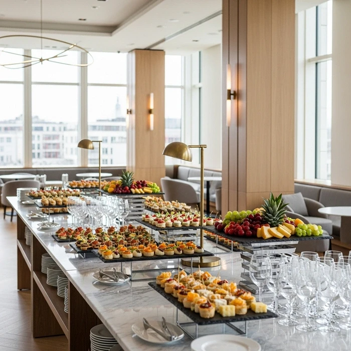 Your service timeline determines staffing, equipment, and kitchen load. A seated plated dinner for an awards gala requires a fundamentally different operation than a networking reception with live cooking stations. Document arrival beverage windows, transition timing between courses, speech breaks that pause service, and dessert and coffee alignment with the program close. Share this timeline during the RFP stage — not after contracting.