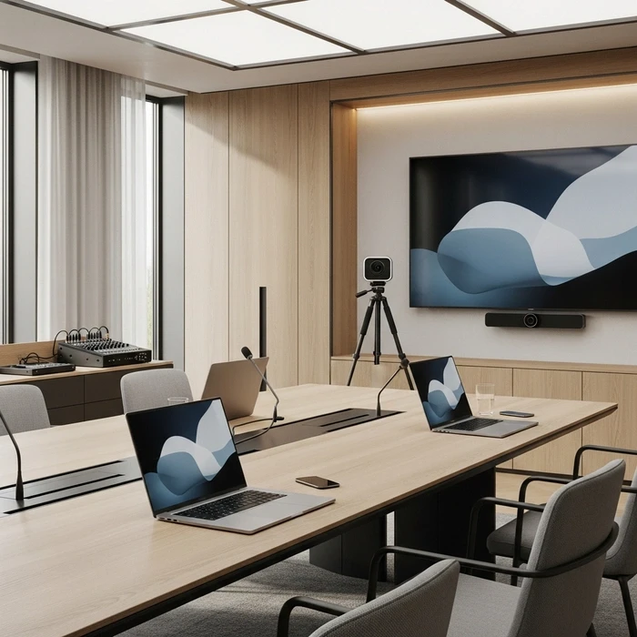 A professional hybrid conference streaming setup should define in advance: