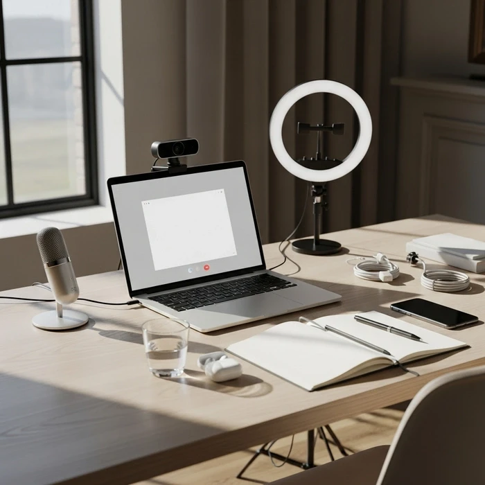 Specify camera framing standards in your briefing: eyes in the upper third of the frame, neutral or branded background, no backlight from windows. For optimal lighting at home/office, recommend a front-facing ring light or a desk lamp positioned at 45 degrees. Poor lighting makes even a CEO look unprofessional when projected on a venue screen.