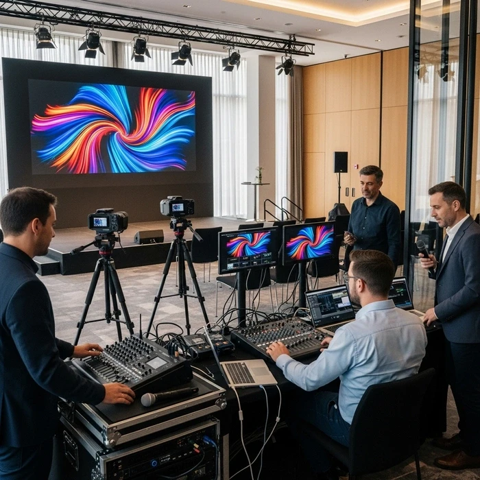This is where many teams underestimate the complexity. A hybrid event is not just a room with a laptop and webcam. The virtual audience expects a polished broadcast experience.