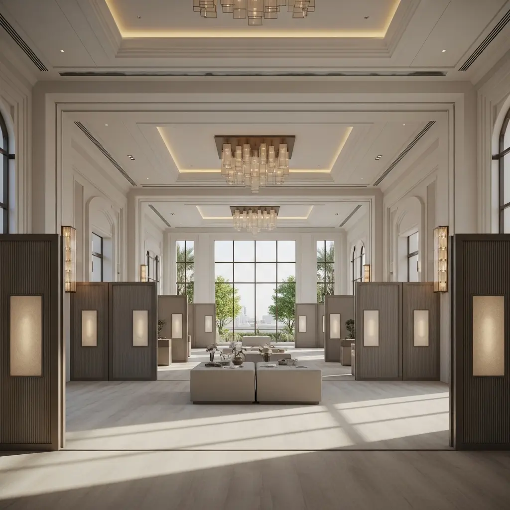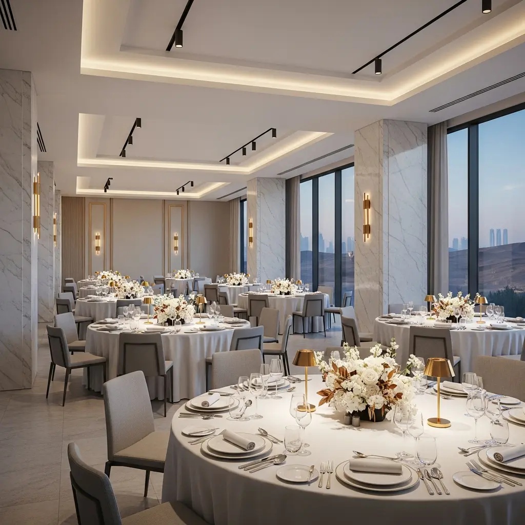 Most UAE hotel venues include in-house catering, standard AV, tables, linens, basic staging, and an event manager in packages. Extras like LED walls, premium sound, elaborate décor, outside catering, and late-night extensions incur fees; halal, kosher, and vegan menus are available; valet and room blocks can bundle.